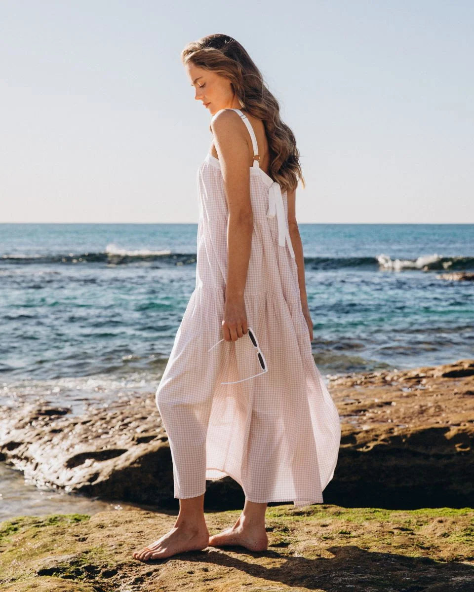 A taupe and white check maxi dress. White contrast straps with a cute tie in the back. Fully lined. Add a Straw hat and bag for a summer's day party.