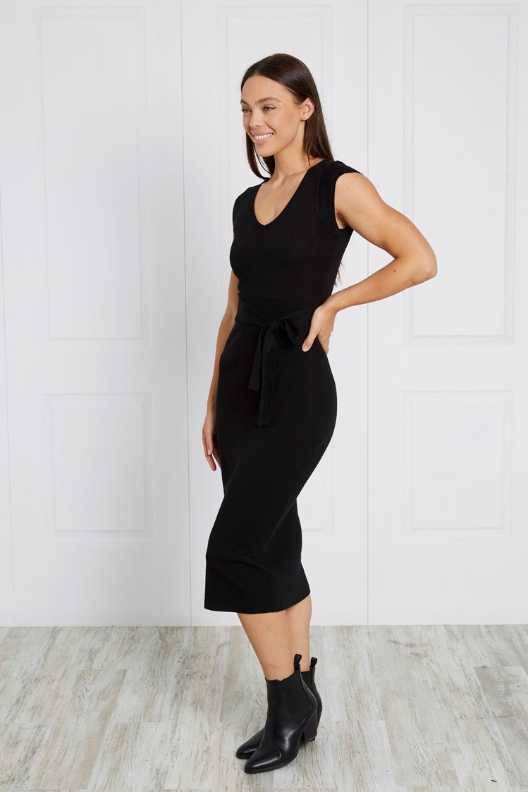 Fitted Cap sleeved knitted black dress. Tie waist. V-Neck. Midi Length.