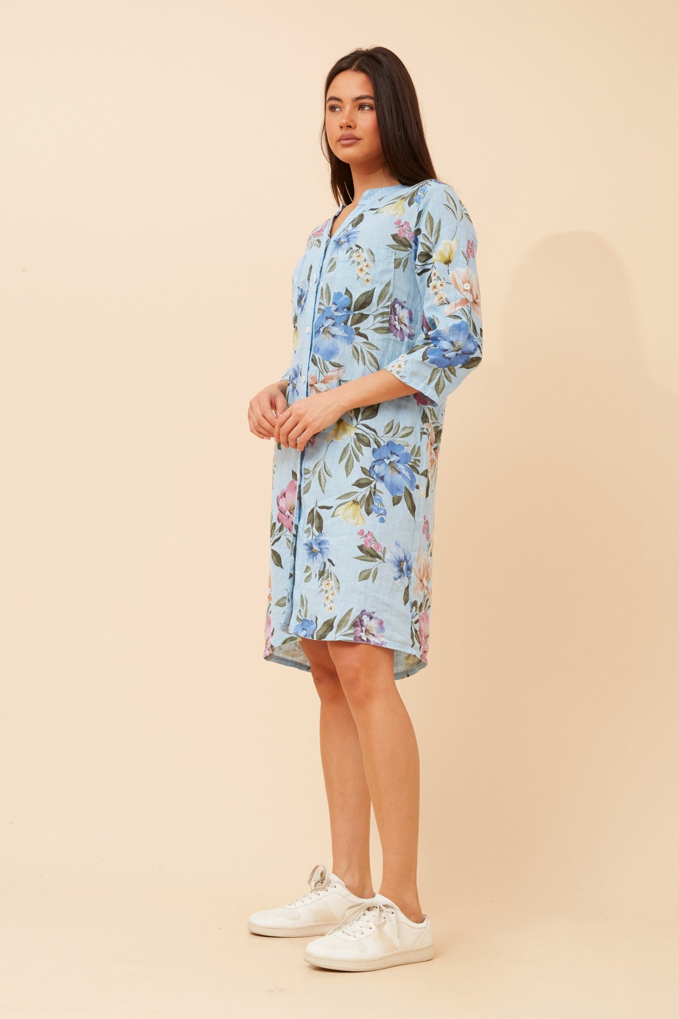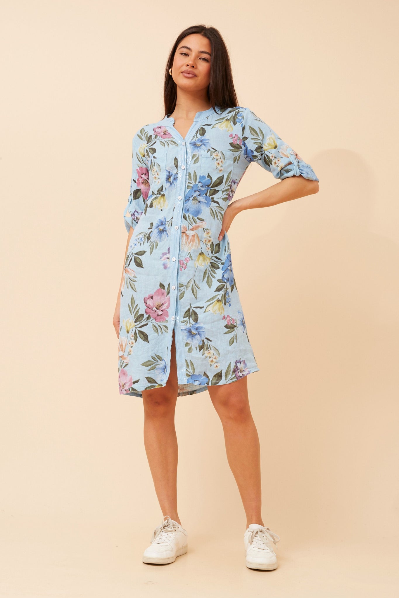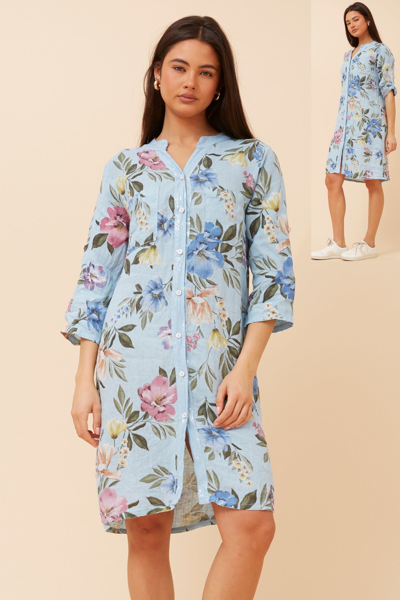 Short-sleeve button up dress with pockets and sequin details. Italian Made.