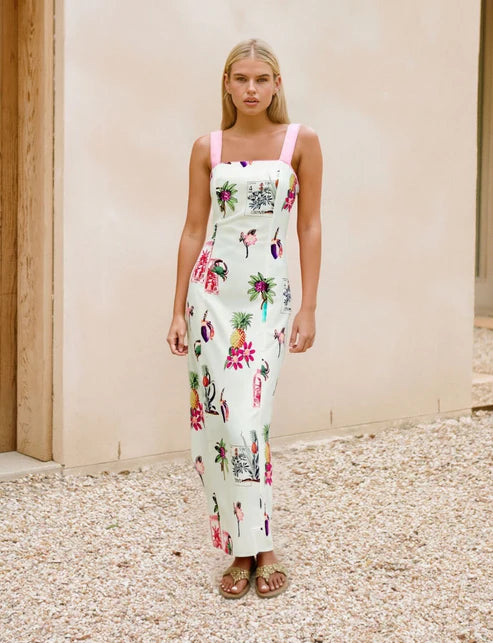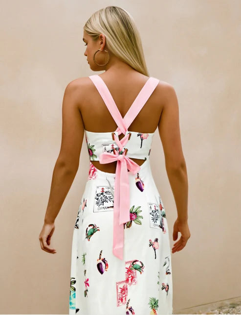 A gorgeous tropical printed midi dress. Pinafore tie-back with a pink bow. Perfect dress for summer parties.
