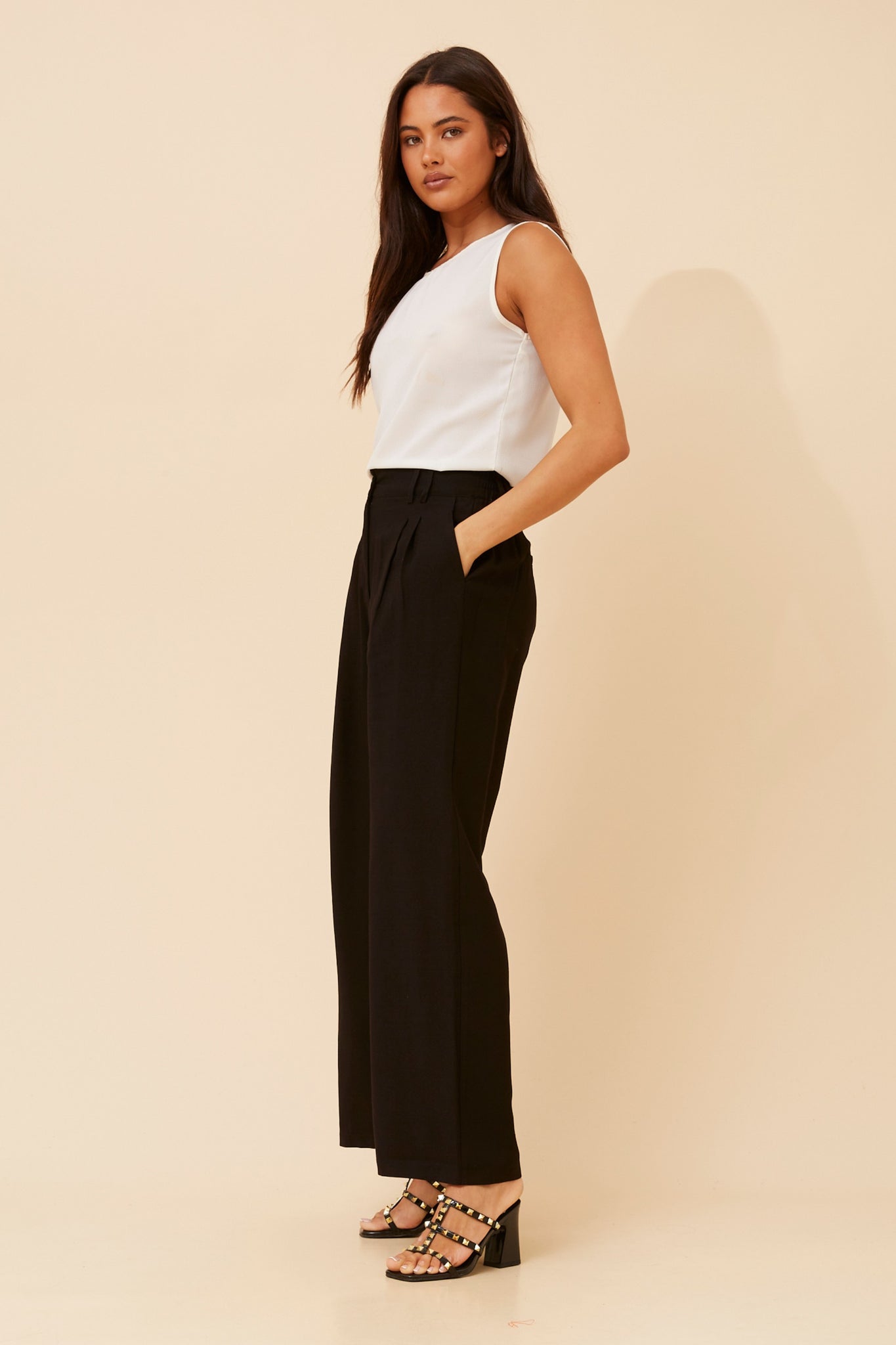 Black linen blend wide-leg pant. Pleated front with elastic waist in back.