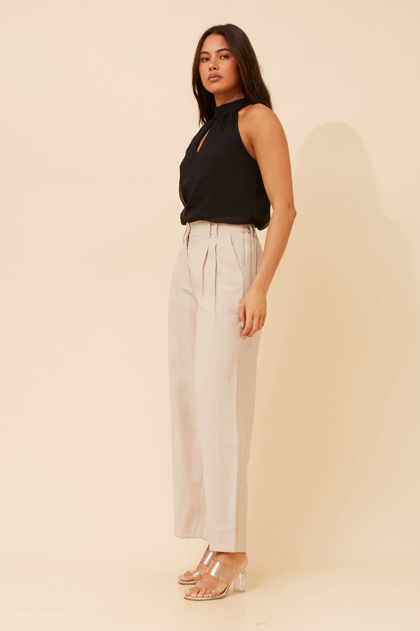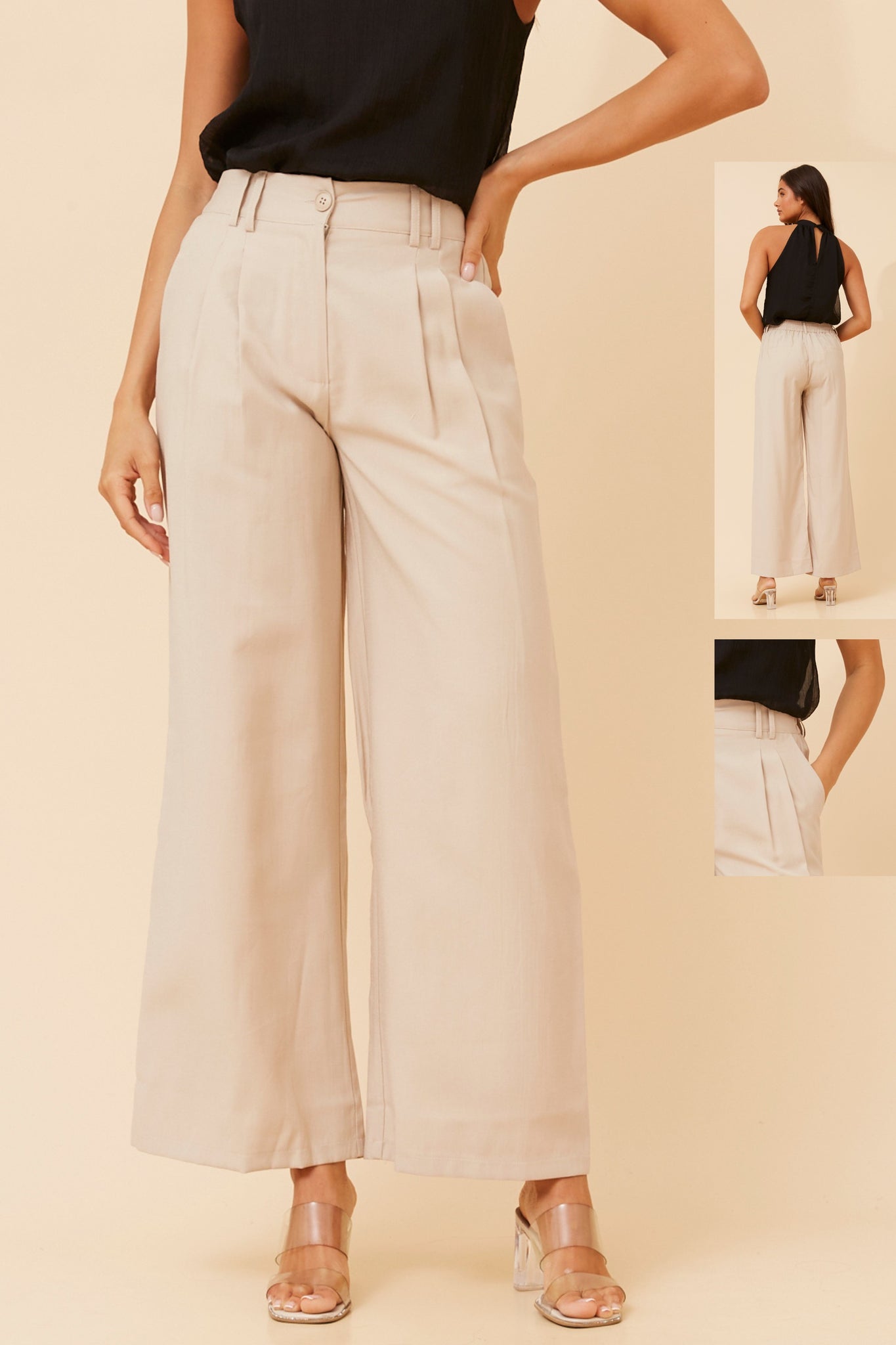 Long wide Leg Pant in a linen mix. Elastic waist in the back with pleated front.