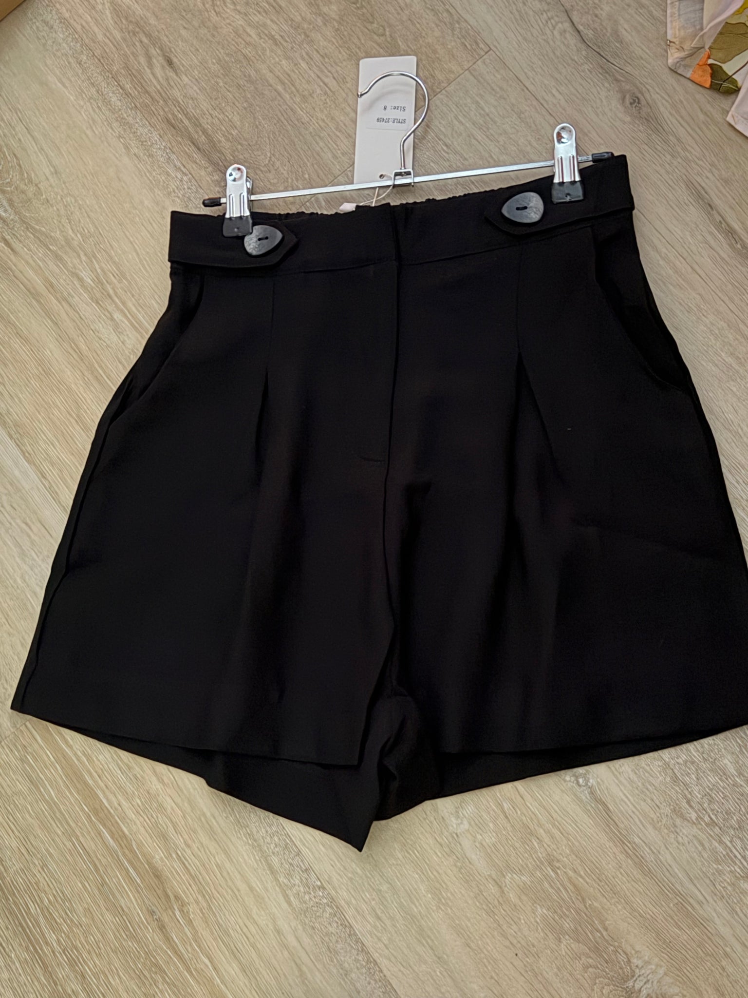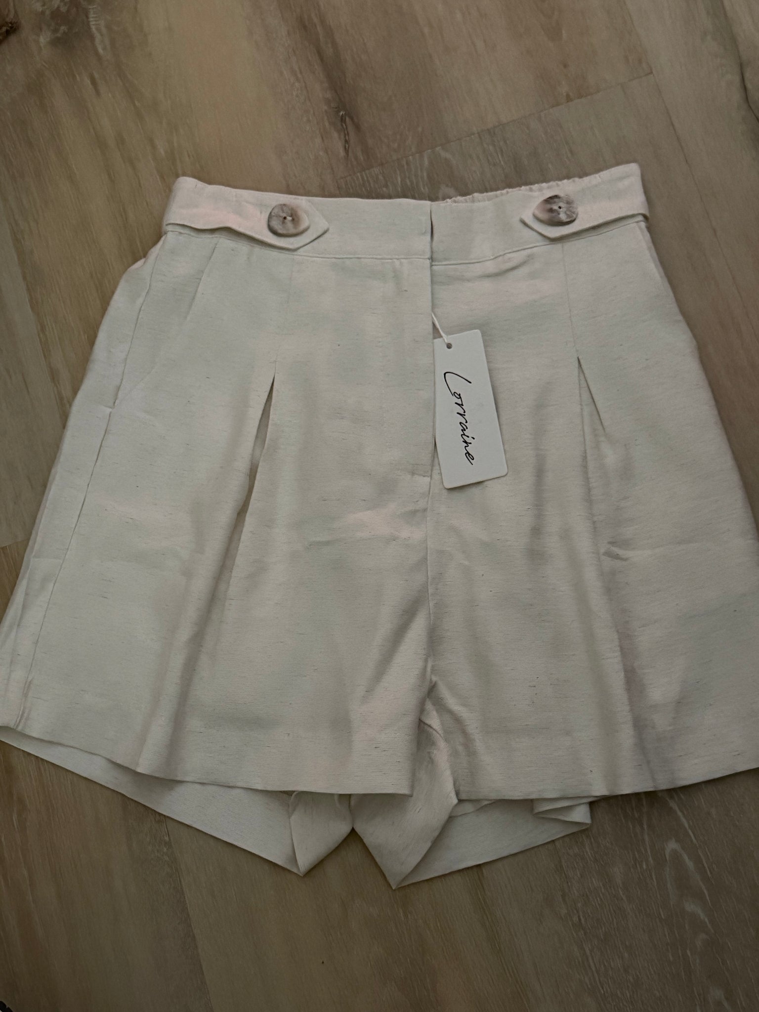 Pleated front shorts with a tab button detail on the band. Pocket and an elastic waist at the back for comfort.